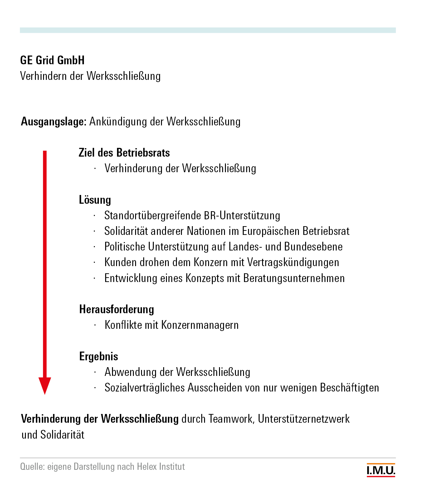 Ende 2019 stand der Standort von GE Grid Solutions in Kassel aufgrund des Plans einer Standortverlagerung in die Schweiz vor der Schließung. Trotz zuvor teilweise negativer Betriebsergebnisse hatten die profitablen Produkte weiterhin Potenzial. Der Betriebsrat entschied sich für eine ähnliche Strategie wie in Mönchengladbach. Auch hier konnte er die Kunden und die Politik auf seine Seite ziehen.